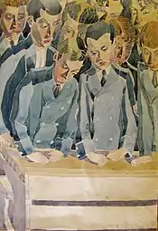 In 1919, he resumed his studies at the Academy with Yulian Pankevych, among others. After graduating, he worked as a drawing teacher; initially at the Stanislaus Ukrainian Gymnasium (1920-1926). After 1925, he was a regular contributor to the satirical magazine Zyz (Squint), published in Lviv. One of his contributions was an unflattering caricature of the school's Director, which resulted in his dismissal.[2] He then went to teach in Sniatyn (1926-1928).[1] While there, he met and married Maria Karpyuk (1900-1978), a pupil of Oleksa Novakivskyi.[3] They returned to Ivano-Frankivsk, where he had been offered a job at the gymnasium.
