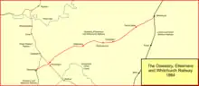 Wrexham was an important focus of coal and iron extraction. The London and North Western Railway was increasing its interests in the area, and wanted a link to its system from Wrexham. This could most conveniently be achieved by a link to Ellesmere on the OE&WR, and this was authorised by Parliament on 31 July 1885 as the Wrexham and Ellesmere Railway. It opened on 2 November 1895. There was a triangular junction at Ellesmere, but the Oswestry-facing curve was not much used until after 1911, when iron ore flows to and from South Wales were important for a few years. The southern end of the Wrexham line and the junctions at Ellesmere closed in 1962.[6]