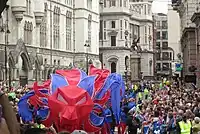 Around 830 athletes travelled in 21 floats along the parade, with each float carrying around 40 athletes.[1][2][3] The number of athletes include 541 athletes from the 2012 Summer Olympics and 289 athletes from the 2012 Summer Paralympics. The floats were arranged by sport and travelled in alphabetical order.[4][5][8] The head of the parade was a commissioned carnival group Kinetika and their independent musical group Kinetika Bloco made up of young people from South London, including students from Highshore Special Needs Secondary School. The group consisted of a Brazilian Style Bloco Orchestra, Acrobatic Trickers called the Catchy Shubby Elite, dancers and the theatre group Smoking Apples[9] carrying two giant lion heads, each with the motifs of Team GB and Paralympics GB, going first.[4]