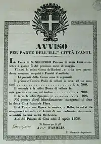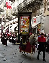 In the 18th century the palii were combined to make a banner, usually blue, decorated with coats of arms of Savoy, the comune, the governor and the podestà (chief magistrate). The image of San Secondo riding a horse made its appearance on the palio banner dedicated to the church: at the end of the nineteenth century, it was also present on the palio banner given to the winner.