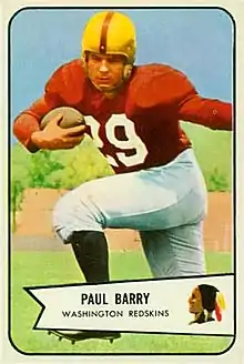 Paul F. Barry (August 7, 1926 โ December 28, 2014) was an American football running back in the National Football League for the Los Angeles Rams, Washington Redskins, and Chicago Cardinals. He played college football at the University of Tulsa[1] and was drafted in the thirteenth round of the 1949 NFL Draft.