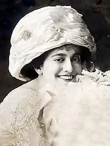 A peach basket hat (sometimes fruit basket hat[1]) is a millinery design that resembles an upturned country basket of the style typically used to collect fruit. Generally it is made of straw or similar material and it often has a trimming of flowers and ribbons. Some models may also feature a veil or draped fabric covering.[2] It was introduced in around 1908 and caused some controversy over the succeeding year due to its extreme dimensions and decorations. It had revivals – designs were at this stage more modest – in the 1930s and 1950s.