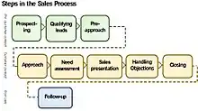 The first text to outline the steps in the selling process was published in 1918 by Norval Hawkins.[18] The basic steps, which have changed only a little since Watkins first proposed them, are prospecting, qualifying leads, preapproach, approach, need assessment, presentation, meeting objections, closing the sale and following up.[19]