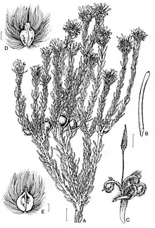 Petrophile arcuata is a shrub that typically grows to a height of 0.7–1.5 m (2 ft 4 in – 4 ft 11 in) and has more or less glabrous branchlets. The leaves are cylindrical, 5–15 mm (0.20–0.59 in) long and 0.7–1.0 mm (0.028–0.039 in) wide. The flowers are arranged in sessile, oval to spherical heads about 12 mm (0.47 in) in diameter, with a few glabrous egg-shaped involucral bracts at the base. The flowers are about 12 mm (0.47 in) long, creamy yellow to yellow and hairy. Flowering occurs from September to October and the fruit is a nut, fused with others in a more or less spherical head 10–15 mm (0.39–0.59 in) in diameter.[2][3]