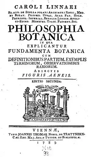 - Linnaeus, Carl (1755) [1751]. Philosophia botanica: in qua explicantur fundamenta botanica cum definitionibus partium, exemplis terminorum, observationibus rariorum, adiectis figuris aeneis. originally published simultaneously by R. Kiesewetter (Stockholm) and Z. Chatelain (Amsterdam). Vienna: Joannis Thomae Trattner. Retrieved 13 December 2015.