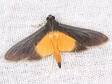 The wingspan is about 35 mm. The forewings are black brown glossed with silvery blue to beyond the end of the cell and on the inner area to the middle. The rest of the wing is glossed with purple. The hindwings are orange yellow, the terminal area is black brown glossed with purple.[2]