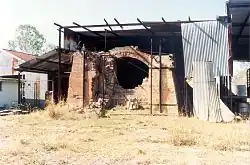 The bricks at Pindi Pindi were made by the semi-plastic method. A tramline ran from the clay and shale pit to the works. The clay was ground in the pan and then dropped into the brick press. The building bricks and fire bricks used the dry press method, however, bricks for fire arches in locomotive fireboxes had to be fashioned manually.[1]