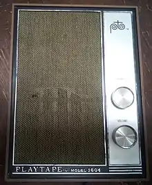 PlayTape is a 1⁄8 inch (3.2 mm)[2] audiotape format and mono or stereo playback system introduced in 1966 by Frank Stanton.[3] It is a two-track system, and was launched to compete with existing 4-track cartridge technology. The cartridges play anywhere from eight to 24 minutes, and are continuous. Because of its portability, PlayTape was an almost instant success, and over 3,000 artists had published in this format by 1968. White cases usually meant about eight songs were on the tape.[4][5]