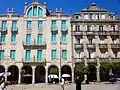 To the west of the square are two remarkable Art Nouveau buildings. The Art Nouveau building at number 8, further south, is the older of the two. It was designed by the architect Andrés López de Ocáriz Robledo, who completed the project in June 1912.[16] The building was promoted by Juan Pazos, a rich emigrant who returned from America, who bought four of the five small 15th-century houses that bounded the square to the west and which were demolished.[17] It consists of a ground floor with double-height arcades, three floors and an attic. Art Nouveau decoration with floral and geometric motifs appears on the main façade above and below the doors and windows, as well as on the central curved pediment with a semicircular arch and on the cornices on either side of it.[16] The building has two large central wrought iron balconies on the first two floors and four side balconies on the third floor. It was completely renovated in 2007 by the architects César Portela and Enrique Barreiro Álvarez.[18]