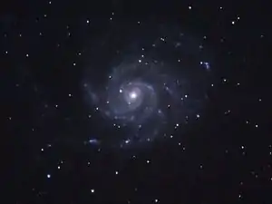 ![]() The Pinwheel Galaxy , or M101, was discovered by Pierre Méchain, on March 27, 1781, and is located between 23,790,000 or 27,000,000 light years from Earth. It is the brightest galaxy in the M101 group of galaxies, with an apparent magnitude of +7.9 and an absolute magnitude of -21.6. The Pinwheel galaxy can be found in the Ursa Major constellation, and the M101 group of galaxies. This picture was taken and released by an amateur astronomer. |