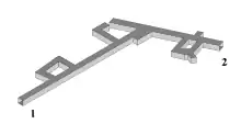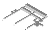 The complex is located inside Soboń Mountain (German: Ramenberg) 50°41′7″N 16°23′58″E and is accessible by tunnels number 1 (216 m) and 2 (170 m).[147] Tunnel number 3 is not connected to the main underground. It is collapsed in its initial part on the length of 83 m.[148] In 2013 it was explored when a shaft was dug from above, revealing 86 m of tunnel with mining equipment from 1945.[149] The total length of the complex is 700 m (1,900 m2, 4,000 m3).[150][148] Less than one per cent is reinforced by concrete.[82]