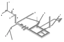 The complex is located in the village of Jugowice (Jawornik) (German: Hausdorf (Jauering)), inside Dział Jawornicki Mountain (German: Mittelberg) 50°42′35″N 16°25′12″E. Tunnels number 2 (109 m) and 4 lead to a small underground level. There is a shaft with a diameter of 0.5 m – 0.6 m (16 m) in the vicinity of the complex but not connected to it. Tunnel number 6 is collapsed 37 m from the entrance and has not been explored yet. It was closed by two steel doors 7 m apart.[140][141] The rest of the tunnels are in the initial stage of construction: 1. (10 m), 3. (15 m), 5. (3 m), 7. (24.5 m). The total length of the structure is 460 m (1,360 m2, 4,200 m3).[142] Less than one per cent is reinforced by concrete.[82]