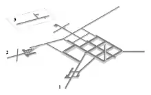 The structure is a grid of tunnels (1,750 m, 6,700 m2, 30,000 m3)[124] and underground halls, up to 8 m in height. Only 6.9% is reinforced by concrete.[82] There is a shaft leading to the surface with a diameter of 6 m (48 m).[101] Tunnel number 3 (107 m) is not connected to the complex. It is 500 m away and 45 m below the main underground.[123] It contains two dams and hydraulic equipment of an unknown purpose.[125]