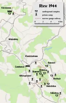 In April 1944, dissatisfied with the progress of the project, Adolf Hitler decided to hand over the supervision of construction to the Organisation Todt and assign prisoners of concentration camps to work.[39][40][41] They were deployed in thirteen labour camps (Arbeitslager, AL), some in the vicinity of the tunnels. The network of these camps has been named Arbeitslager Riese (List of camps) and was part of the Gross-Rosen concentration camp.[42][22] The administration of AL Riese and the camp commander, SS-Hauptsturmführer Albert Lütkemeyer,[43][44] were located in AL Wüstegiersdorf.[45] From December 1944 to January 1945 the prisoners were guarded by 853 SS troops.[20][9]
