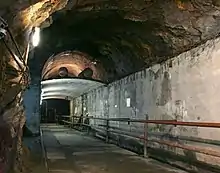 The second level of underground (950 m, 3,200 m2, 13,000 m3) is 53 m under the courtyard.[79][76] Four tunnels were bored into the base of the hill: 1. (88 m), 2. (42 m), 3. (85 m), 4. (70 m).[80] The complex contains large tunnels (5 m high and 5.6 m wide) and four chambers.[81] Seventy-five per cent is reinforced by concrete.[82] There are two additional shafts leading to the surface, one with dimensions 3.5 m x 3.5 m (45 m)[83] and one with diameter 0.5 m (40 m),[84][85] presently used to supply electricity.[86]