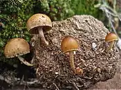 Psilocybe hispanica is a coprophilous fungus (dung-loving), and produces fruit bodies that grow solitarily or in dense groups on horse dung; sometimes more than 25 fruit bodies can arise from the same dung.[5] In Guzmán's original report, they were found in a Pyrenean meadow in Aragon, at an elevation of 2,300 metres (7,500 ft). In 2003, the species was reported from Tramacastillo de Tena, a small village in the Pyrenees; it was also reported to have "penetrated the French part of the Pyrenees". Within its restricted range, the mushroom is "very common" at altitudes of 1,700 to 2,300 m (5,600 to 7,500 ft).[5]