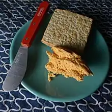 Pub cheese is a type of soft cheese spread and dip prepared using cheese as a primary ingredient and usually with some type of beer or ale added.[1] It can be made with smoked cheeses or liquid smoke added to impart a smoky flavor.[2][3] It is typically served with crackers or vegetables, whereby the cheese is spread onto these foods, or the foods may be dipped in it.[4] It is also used as a topping on sandwiches, such as hamburgers.[5] Pub cheese is a traditional bar snack in the United States.[6]