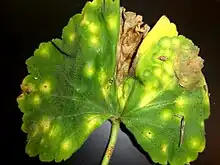 | Symptoms of rust infection on the upper side of a geranium leaf | |