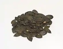 Styrian oil – an export commodity of Austria and Slovenia – is made by pressing roasted, hull-less pumpkin seeds from a local variety of pumpkin, the "Styrian oil pumpkin" (Cucurbita pepo subsp. pepo var. 'styriaca',[4][5] also known as var. oleifera). High-temperature roasting improves the aromatic quality of pumpkin seed oil.[6]