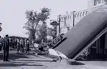 In 1957, an accident knocked down the forecourt awning and damaged the gasoline pumps. Ten years later a fire started in the kitchen and destroyed most of the Tavern.[54] What was left standing at the site was stripped and carried off by souvenir hounds. Fueled by the renewed interest in the Barrows from the 1967 movie, merchants in Weston sold bricks from the building for $1 apiece on the street during the late 1960s.[53] Changing highways ultimately ended the business, as the construction of access roads for the nearby interstate demanded the demolition of the Red Crown and Slim's Castle.[54]