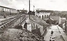 The original 489 feet (149 m) viaduct was built in timber to the designs of Isambard Kingdom Brunel, but it was replaced in 1888 by a masonry structure by P.J. Margery for the GWR.[3][5] The line had until now been just a single track with a passing loop in the station, but the new viaduct was wide enough for two tracks once the 7 ft (2,134 mm) gauge rail was no longer required following the abandonment of broad gauge services in 1892. The second line was brought into use over the viaduct in February 1894 and extended eastwards beyond the station in 1911.[6]