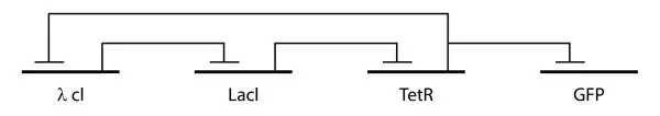 The repressilator consists of three genes connected in a feedback loop, such that each gene represses the next gene in the loop and is repressed by the previous gene. In the synthetic insertion into E. Coli, green fluorescent protein (GFP) was used as a reporter so that the behavior of the network could be observed using fluorescence microscopy.