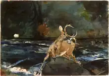 Right and Left is a 1909 oil on canvas painting by the American artist Winslow Homer. It depicts a pair of common goldeneye ducks at the moment they are hit by a hunter's shotgun blast as they attempt to take flight. Completed less than two years before his death, it was Homer's last great painting,[1] and has been the subject of a variety of interpretations regarding its origin, composition and meaning. As with his other late masterworks, it represents a return to the sporting and hunting subjects of Homer's earlier years, and was to be his final engagement with the theme. Its design recalls that of Japanese art, and the composition resembles that of a colored engraving by John James Audubon.
