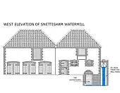 On the river at Snettisham stands a watermill TF68083346 52°52′21″N 0°29′45″E. This was built in 1800 for £800 at a time when bread was scarce and it was built by the community of Snettisham for the people of the village. It is believed that the present mill was built on an existing site although virtually no records have so far been found apart from the fact that Thomas Stonne was a Snettisham miller in 1626. At the time of Domesday, there were seven mills in Snettisham more than in any other Norfolk village. Today's mill is very small and originally consisted of a single small structure built of local dark brown carrstone with a pantiled roof. In 1877, machinery was improved and a granary and wagon store were added to the complex. The mill had three pairs of stones and unusually the larger two pairs were driven from above and the smaller pair from below, the latter pair required less power and was used when water levels were low. The mill worked on until 1940 producing flour and after that was used for animal feed production until 1960. The mill was restored, and brought back to working order by 1984. It was sold in 2008, and a planning application lodged to part convert it to holiday accommodation.[2] Permission was refused. 1 September 2008.[3]