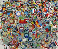 His next series, Pedazos Del Mundo, begun in 1961, is the first of Neuman's series to prominently utilize symbolism as a means of expression and has become his most celebrated body of work. When speaking of the series, Neuman has remarked, "The world is in pieces culturally: liquids, solids, gases, languages, every way you can think about it... so I painted a circle and I made it in pieces”.[21] Pedazos exhibits "the full bloom of the graphical flair and unfailing liveliness that distinguishes Neuman’s style for the next half century".[22] Neuman continued to use the symbol of the circle in Space Signs, begun in 1966, by using tin cans, beer bottles, lamp shades and other round objects "to stamp out resplendent orbs of color over pulsating geometric landscapes".[23] Stacks and Piles, begun in 1975, saw Neuman's return to earth. When creating this series he was influenced by cairns, a man-made pile of stones traditionally found on hiking trails. Neuman translated the cairns into heaps of shapes, piled skyward on canvases that reached upwards of eight feet high.[24]