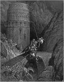 Rodomonte (or Rodamonte) is a major character in the Italian romantic epic poems Orlando innamorato by Matteo Maria Boiardo and Orlando furioso by Ludovico Ariosto. He is the King of Sarza and Algiers and the leader of the Saracen army which besieges Charlemagne in Paris. He is in love with Doralice, Princess of Granada, but she elopes with his rival Mandricardo. He tries to seduce Isabella but she tricks him into killing her by mistake. In remorse, Rodomonte builds a bridge in her memory and forces all who cross it to pay tribute. When the "naked and mad" Orlando arrives at the bridge, it is Rodomonte, the pagan, who throws him into the river below. They both swim ashore, but Orlando who is naked and is unimpeded by heavy armor gets to the shore first. Finally, Rodomonte appears at the wedding of Bradamante and Ruggiero and accuses Ruggiero of treason for converting to Christianity and abandoning the Saracen cause. The two fight a duel and Rodomonte is killed.