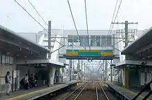 The station has two opposing side platforms serving Track 1 and Track 2 which are on headshunts, allowing for tracks for express trains to pass in between. The platforms are connected by an elevated station building built over the tracks. The station building has automated ticket machines, TOICA automated turnstiles and a staffed ticket office.