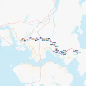 After Kowloon Bay, the road makes a few sharp bends before entering Lung Cheung Road. The route continues heading west and passes through the suburbs of Diamond Hill, Wong Tai Sin and Wang Tau Hom. The road becomes considerably steeper near the exit for Lion Rock Tunnel, and follows the foothills of northern Kowloon. At Tai Wo Ping, the route interchanges with Tai Po Road and continues as Ching Cheung Road, bypassing Sham Shui Po and Cheung Sha Wan before terminating at Kwai Chung and joins Route 5 again.[2]