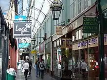 The Royal Arcade is the oldest arcade in Cardiff, being built in 1858, it is a Grade II listed building. In 1861, a free library was set up by voluntary subscription above the St Mary Street entrance to the Royal Arcade in Cardiff.[1] Before the end of the 19th century the Cardiff School of art was using rooms above the arcade with students such as J. M. Staniforth and Goscombe John attending.[2] Running east/west from The Hayes to St Mary's Street, parallel but to the south of the Morgan Arcade, it also runs under David Morgan's department store. After Morgans bought the Royal Arcade, the family formed a holding company called the Cardiff Arcade Company, which owned and operated both the Royal and the Morgan arcades.