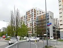 While most of Służewiec neighbourhood is covered by office buildings, a comparably small portion of the neighbourhood consists of the multifamily residential apartment buildings, mostly located at the perimeters of the office zones.[6] The neighbourhood is inhabited by a few thousand people, in contrast to estimated 80 to 100 thousand people commuting to the area every day for work.[5][6]