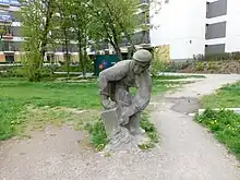 In Służewiec is located the Monument of the Builders of Służewiec Przemysłowy, a Socialist realism sculpture depicting a bricklayer, dedicated to people who worked on the construction of the industrial district of Służewiec Przemysłowy (Industrial Służewiec) in the 1950s. It is located in front of the office building of Park Rozwoju, at Suwak Street. Its author and history remain unknown. Until the 2010s, it was placed in the backyard of the magazines of the Warszawa Północ Industrial Construction Company (Polish: Przedsiębiorstwo Budownictwa Uprzemysłowionego „Warszawa Północ”). In 2015, after the building was deconstructed, and replaced by the office building of Park Rozwoju, the developers had decided to place the historical statue in front of the building. The sculpture is one of the last remaining objects from the industrial history of Służewiec.[40]