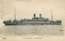 After the Armistice of 11 November 1918 Flandre undertook medical repatriations of troops. While remaining equipped as a hospital ship she also worked as a troop ship, carrying French soldiers in the Adriatic and the Black Sea, and repatriating Serbian troops.[6] By December 1918, Flandre had made 20 voyages in naval service, and had carried 13,799 patients and troops.[7]