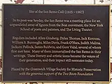 The San Remo Cafe was a bar at 93 MacDougal Street at the corner of Bleecker Street in the New York City neighborhood of Greenwich Village. It was a hangout for Bohemians and writers such as James Agee, W. H. Auden, Tennessee Williams, James Baldwin, William S. Burroughs, Gregory Corso, Miles Davis, Allen Ginsberg, Billy Name, Frank O'Hara, Jack Kerouac, Jackson Pollock, William Styron, Dylan Thomas, Gore Vidal, Judith Malina, and many others.[1][2][3] It opened in 1925[4] and closed in 1967.[5]