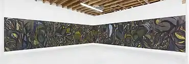 The work in subsequent exhibitions at Project 88 (2011, 2014), Brennan & Griffin (2012) and Chimento Contemporary (2015) featured swirling, zigzagging and entwining sequences of ribbons that shifted between abstraction and suggestions of DNA strands and microscopic, botanic or cosmological forms.[2][18] Their translucent green, brown, orange and yellow bands contained meticulously brushed striations dabbed in layered strokes and were set on black fields creased with webs of collapsing grids and protuberances (e.g., Splice, 2012; the "Tear" and "Palimpsest" series, 2014–5).[10][18] The Chimento show featured Mutual Entanglements, an enveloping, 7 ft × 50 ft (2.1 m × 15.2 m), two-wall mural whose sprayed and dragged brown, green, purple and indigo colors and organic abstraction suggested a lush tropical jungle. The mural was unusual in that its construction and orientation was indeterminate and fluid, with panels that—per Mukherjee's gallery instructions—could be installed in any direction or order and yet retain cohesion, despite the lack of a repeating pattern.[14][43]