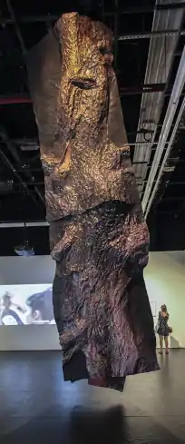 In installations from 2016 to 2020, Mukherjee has extended the dimensionality of his work beyond relief to full sculpture.[44] The 48-foot (15 m) wall-piece Elemental (2016) employed eight folded aluminum panels whose colors and painted forms call to mind molten lava or an evolving universe.[45] In exhibitions at 68 Projects ("Molting the Fractured," Berlin, 2017) and The Kitchen ("On Whiteness," 2018) he presented hand-molded, human-sized aluminum works coated in acrylic that hung from the ceiling and reached the floor; the latter show's Tree Skin (2018) consisted of two pieces that reference oak tree trunks as a corporeal stand-in, evoking both callused and weathered flesh and the sites of lynching to address the violence perpetrated against non-white bodies.[5][44][46]