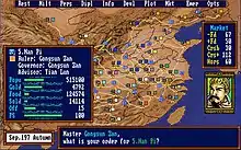 After choosing the scenario, players determine which warlord(s) they will control. Custom characters may be inserted into territories unoccupied by other forces. A total of 46 different cities exist, as well as hundreds of unique characters. Each character has several statistics: War Ability, Intelligence, Politics, Charisma, Army Command, Naval Command.