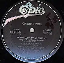 "Saturday at Midnight" is a song from the American rock band Cheap Trick, which was released in 1983 as the fourth and final single from their sixth studio album One on One (1982). It was written by lead guitarist Rick Nielsen and vocalist Robin Zander, and produced by Roy Thomas Baker. Aimed at the club scene, the single reached No. 45 on the Billboard Dance Music/Club Play Singles Chart, and remains the band's only appearance on the chart.[2]