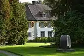 Among the famous residents was the author Mentona Moser (1874–1971) who was raised on the Au peninsula: „Ich habe gelebt“ (I've lived, among others with Au-related descriptions) in one of her published books. Her mother, Fanny Moser was considered one of the richest women in Europe in the 19th century; in her residence „Belle au bois dormant“ she met poets, philosophers, scientists and people perverted from trade and industry. The estate and the little landside lake belong since 1989 to the Canton of Zürich; in 1985 its last owner Eric Alex von Schulthess handed over the property and the comprehensive lands to the canton of Zürich to establish a conference center, and thus to the public.[1] As of 2015 the building is used as conference center Tagungszentrum Schloss Au by the cantonal college of education PHZH.