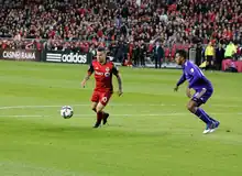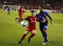 On 19 January 2015, Giovinco signed with Canadian team Toronto FC of Major League Soccer (MLS).[54] He was set to join the team upon the completion of the Serie A season in July 2015. He signed a five-year contract with a reported annual salary of $7 million, making him the highest paid player in MLS ahead of Orlando City SC's Kaká,[55] and the highest paid Italian player in all leagues.[56] On 2 February, Juventus announced that Giovinco had left the club five months earlier than originally expected in order to kick-start his career in MLS with Toronto FC.[57] Giovinco made his debut for Toronto FC against Vancouver Whitecaps on 7 March.[58] He provided an assist for Jozy Altidore's equalising goal in the 32nd minute. He scored his first goal for Toronto FC on 4 April, in a 3–2 loss to Chicago Fire, also later setting up Benoît Cheyrou's goal.[59] On 13 May, Giovinco scored and assisted a goal in a 3–2 home win over Montreal Impact in the return leg of the 2015 Canadian Championship semi-finals, although Montreal progressed to the final on away goals, having won the home leg 1–0.[60] After setting up two goals in TFC's 3–1 home win over San José on 30 May, Giovinco was voted Major League Soccer Player of the Week by the North American Soccer Reporters, for week 13 of the 2015 MLS season.[61] Following his two goals in Toronto FC's 2–1 away win over D.C. United, he was named MLS Player of the Week for a second consecutive time the following week.[62]