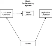 Semi-parliamentary system can refer to either a prime-ministerial system, in which voters simultaneously vote for both members of legislature and the prime minister,[1] or to a system of government in which the legislature is split into two parts that are both directly elected – one that has the power to remove the members of the executive by a vote of no confidence and another that does not.[2] The former was first proposed by Maurice Duverger, who used it to refer to Israel from 1996 to 2001.[1] The second was identified by German academic Steffen Ganghof.[2]