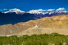 Shanti Stupa is a Buddhist white-domed Stupa (chorten) on a hilltop in Chanspa, Leh district, Ladakh, in north India.[1] It was built in 1991 by Japanese Buddhist Bhikshu, Gyomyo Nakamura. The Shanti Stupa holds the relics of the Buddha at its base, enshrined by the 14th Dalai Lama.[2] The Stupa has become a tourist attraction not only due to its religious significance but also due to its location which provides panoramic views of the surrounding landscape.