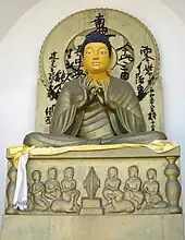 The Shanti Stupa features the photograph of the Dalai Lama with the relics of the Buddha at its base.[4] The Stupa is built as a two-level structure. The first level features the central relief of Dharmachakra with deer on each side. A central golden Buddha image sits on a platform depicting the "turning wheel of Dharma" (Dharmachakra). The second level has reliefs depicting the "birth" of Buddha, the death of Buddha (mahanirvana) and Buddha "defeating the devils" while meditating.[6] Both levels feature a series of smaller meditating Buddha reliefs.