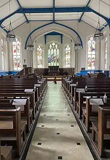 At the south end of the main range there is a chapel, which was added in 1860, indicated by dated rainwater heads to the walls. Internally, the chapel has a wide chancel arch with a canted apse and some stained glass windows, depicting the Life of Christ and Acts of Mercy, by William Morris.[2] It is two-storeys high and is six bays long by five bays wide. It has a quarry-faced plinth, ashlar quoins and stepped buttresses between Perpendicular windows to the ground floor. The chancel window has four trefoil-headed lights beneath more elaborate curvilinear tracery.[3]