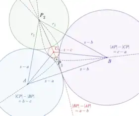 Each of the three circles centered at the vertices crosses two sides of the triangle at right angles, at one of the three intouch points of the triangle, where its incircle is tangent to the side. The two circles tangent to these three circles are separated by the incircle, one interior to it and one exterior. The Soddy centers lie at the common intersections of three hyperbolas, each having two triangle vertices as foci and passing through the third vertex.[1][2][3]