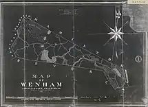 - 1831: Surveyed by Philander Anderson, this map shows the expansion of Wenham’s system of roads, the addition of swampland, and a drawing of the Wenham Meeting House.