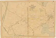 - 1955: The subdivision of the Solomon Kimball farm began in 1955 and continued through the mid-1960s, creating Puritan Road, Mayflower Drive and the lots facing those streets. This 1955 map, drawn at the beginning of the subdivision program, shows the location and outline of the Solomon Kimball House and two outbuildings; note the outline of an ell or porch on the north side of the house that no longer exists.[83]